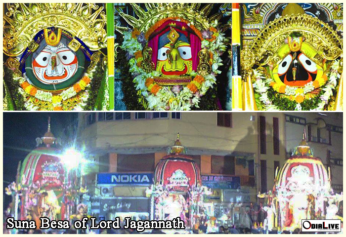 Suna Besa is a festival of grandeur in which Lord Jagannath, Balabhadra, and Maa Subhadra are decorated with beautiful gold ornaments. The ornaments include a golden crown, golden peacock feather, golden necklace, and silver conch. All the ornaments are made up of solid gold and weigh about a ton. Gold ornaments of 138 types and style measuring about one hundred kilos are used to decorate the deities in complete gold.